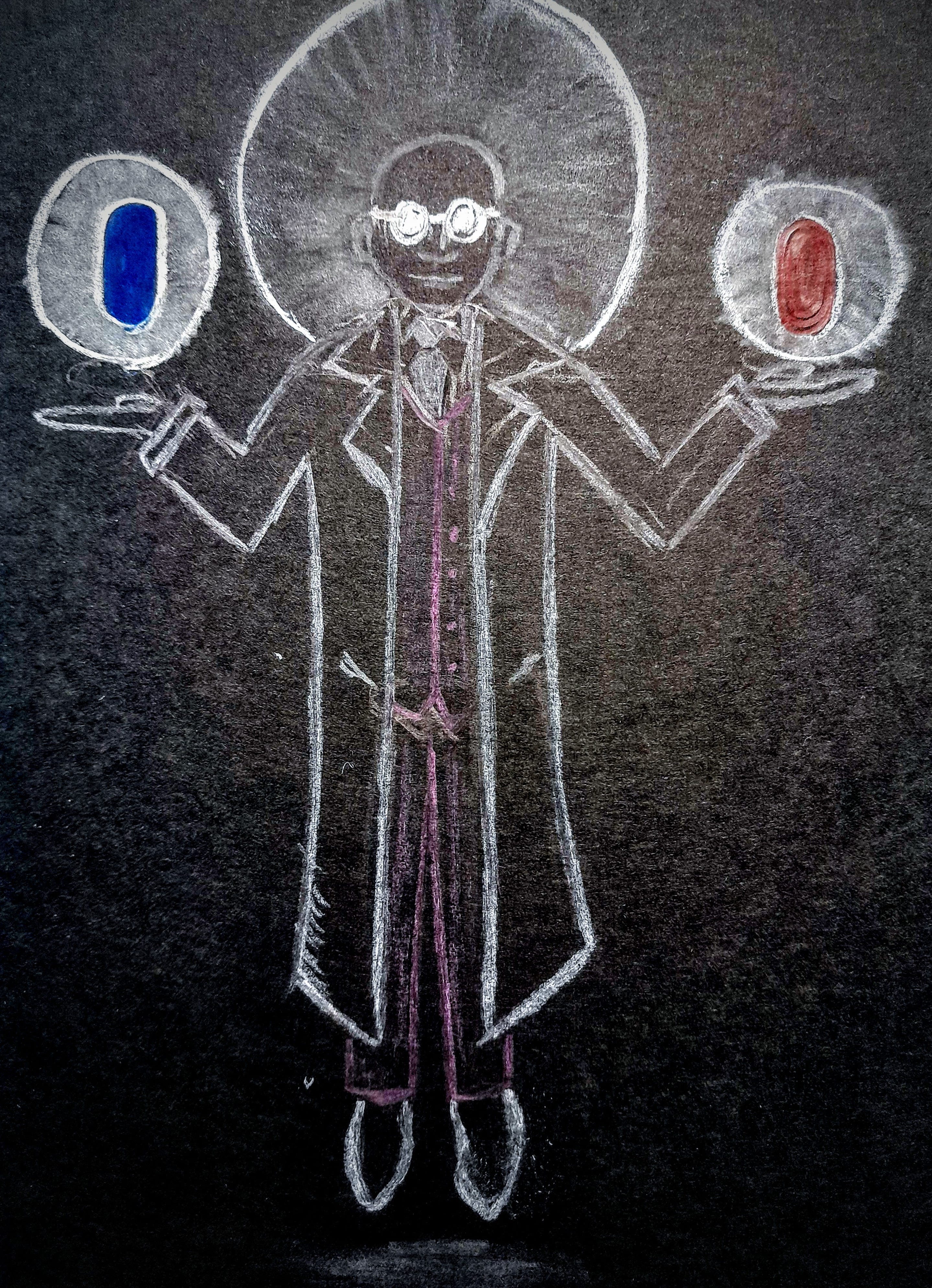 Morpheus (named after the Greek god of dreams, one of the mythic gatekeepers for the Imaginal Realm) offers the neophyte a choice in the form of two pills. The red pill allows Neo to see the world as it truly is. This will strip away the comfortable forms that kept him safe while his identity cohered, allowing him to realize his place within a much wider and more dangerous reality than the nursery-rhyme version he grew up with. The blue pill will keep him in a childlike state of dependence within the world of illusions.